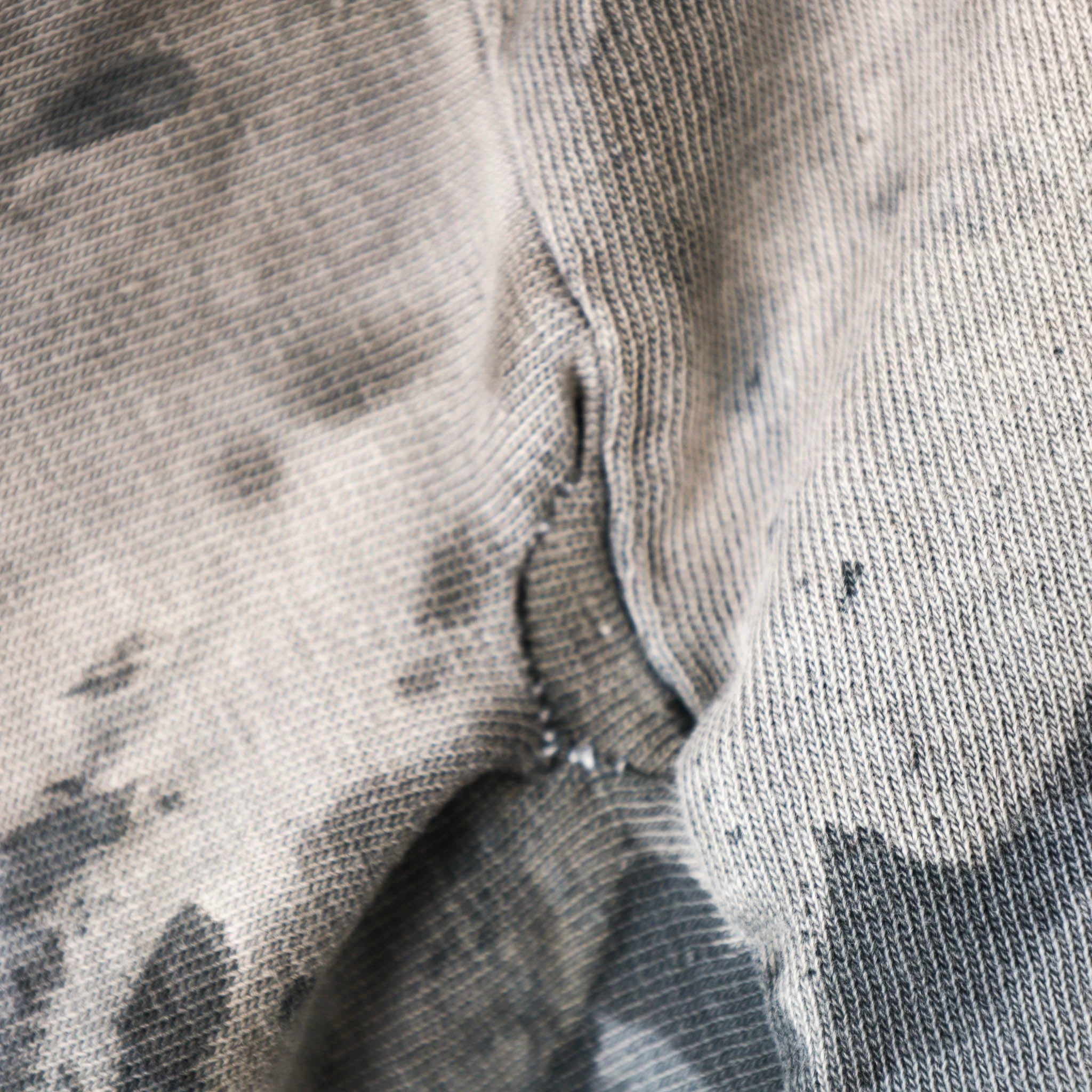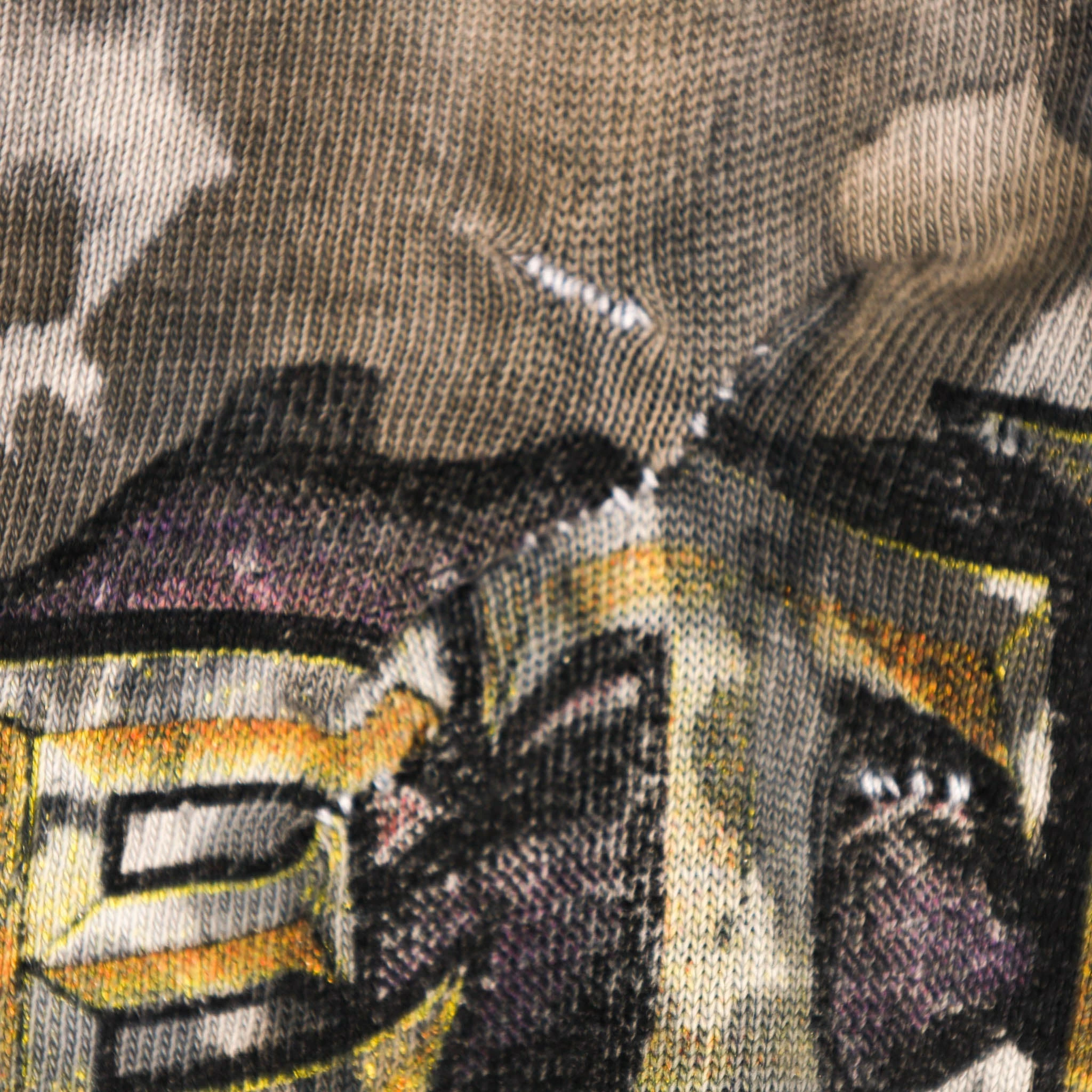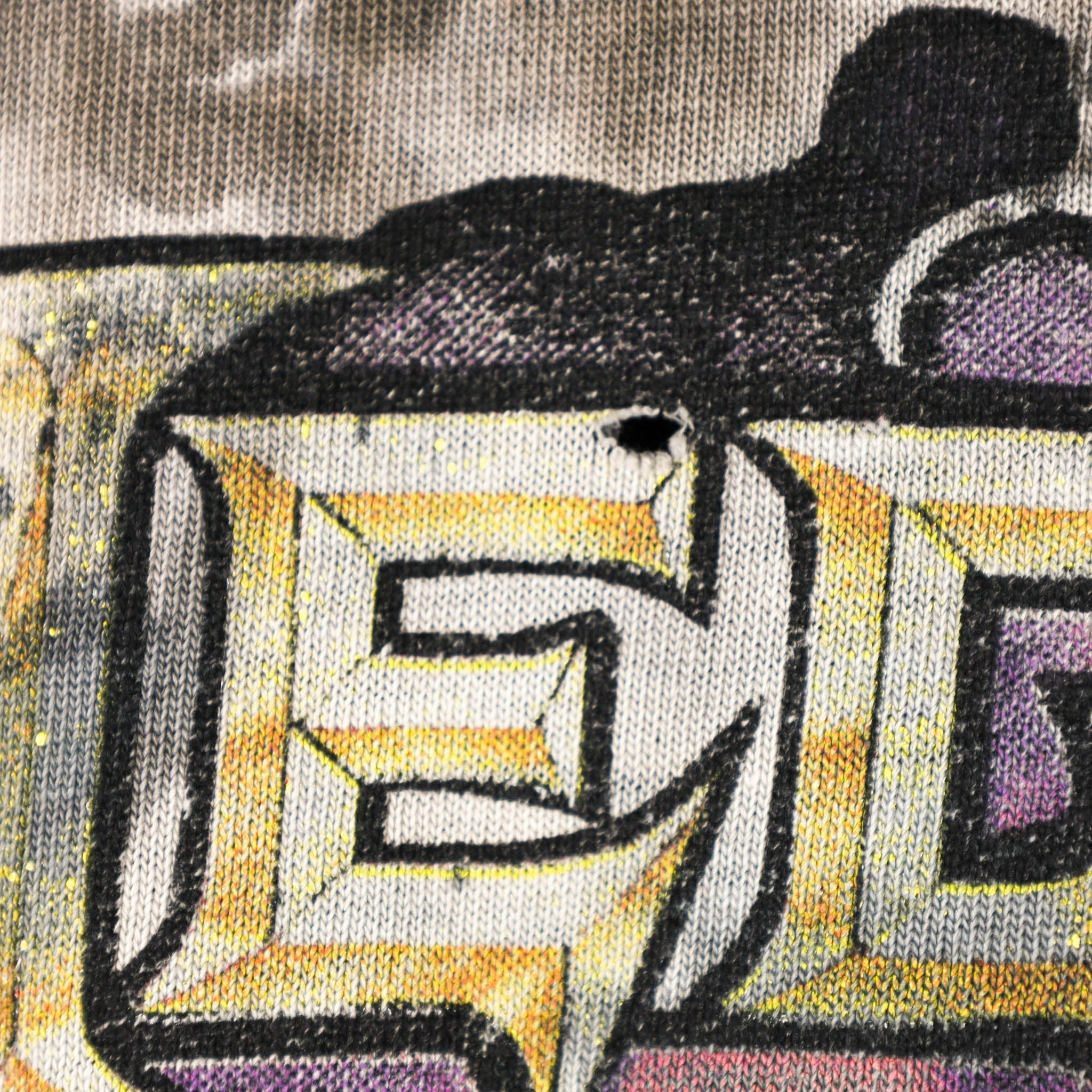 Flaws: fraying on collar. repaired holes under right armpit, on back graphic and on back of left sleeve. pin hole on front and back. fading/cracking on print .