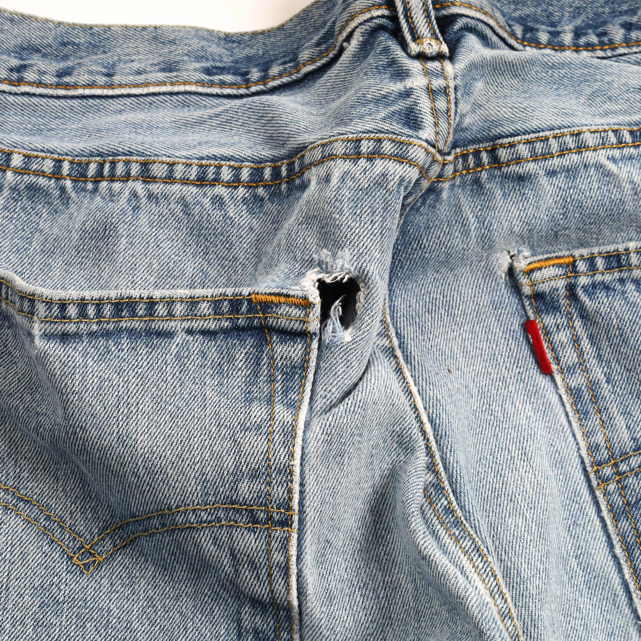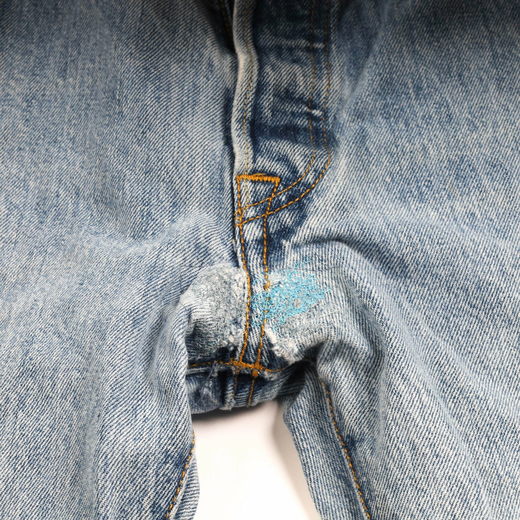 Flaws: stitching near the crotch, scratches on the right leg, small hold on the back .
