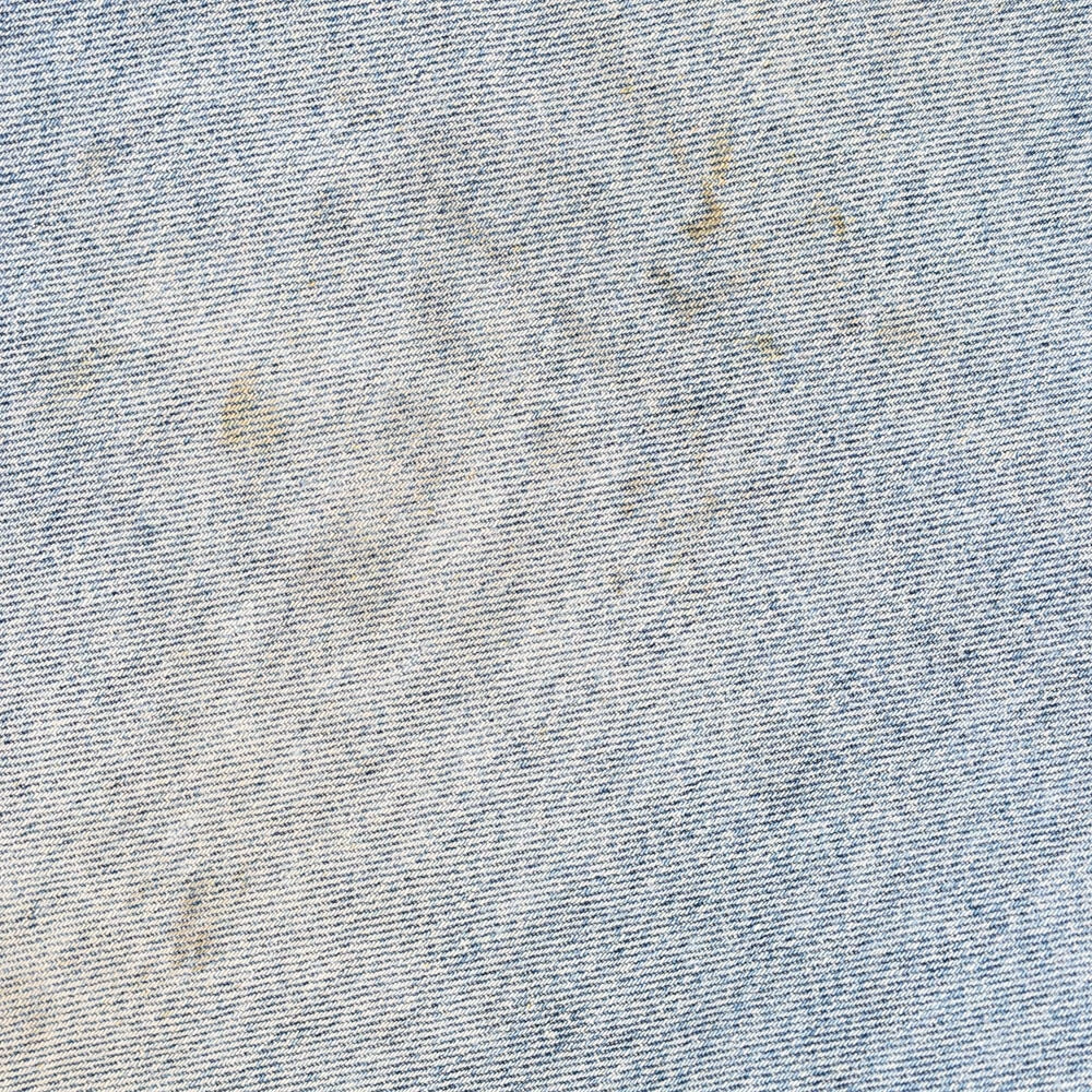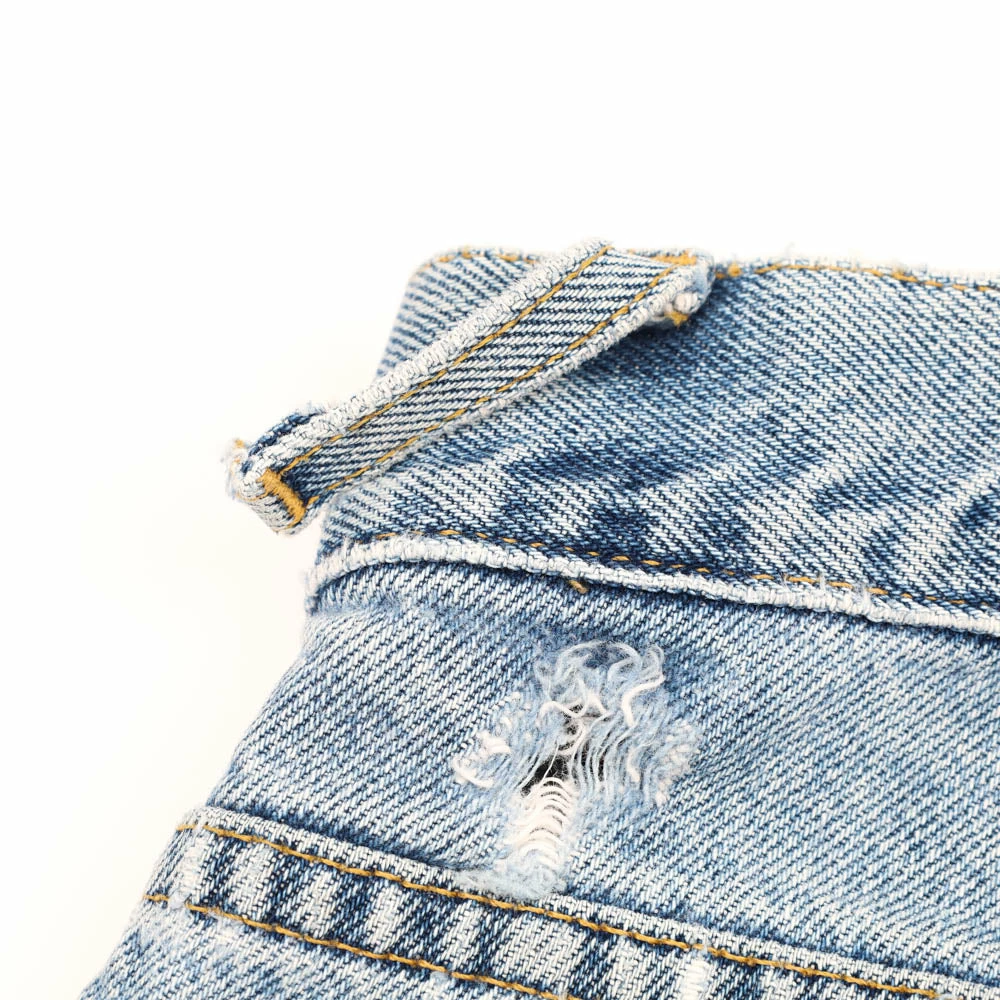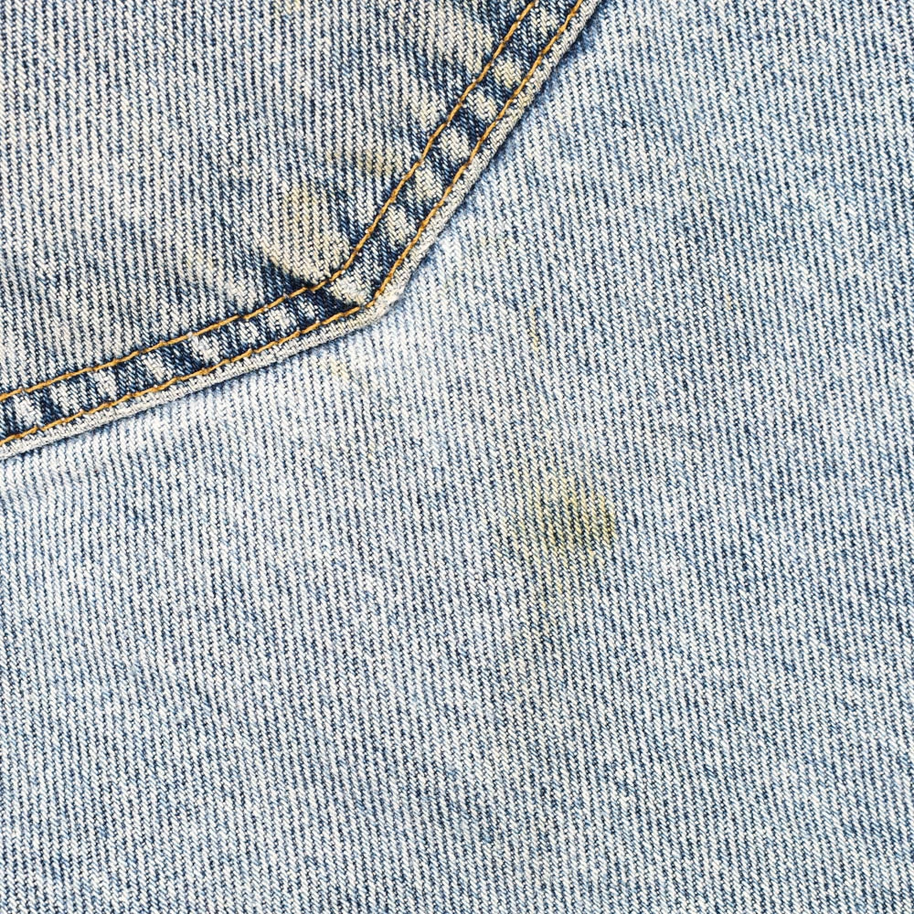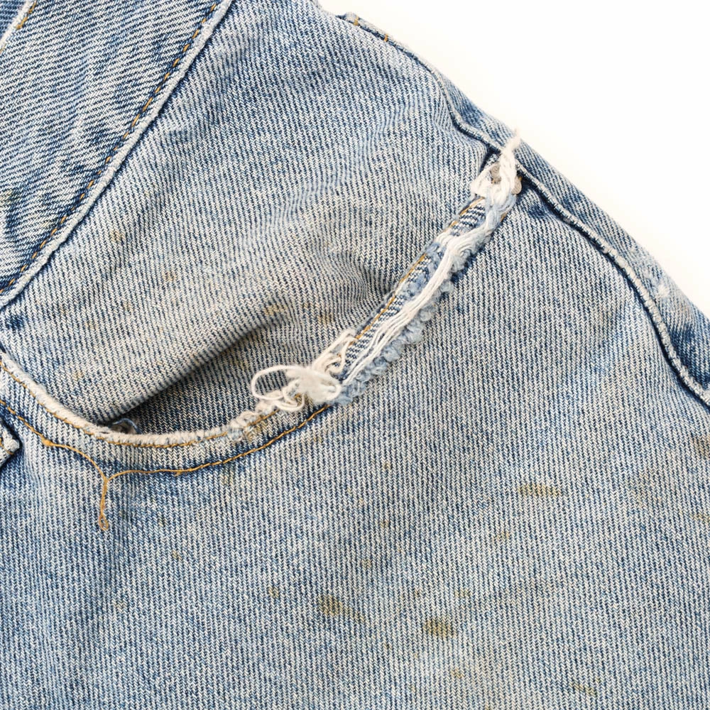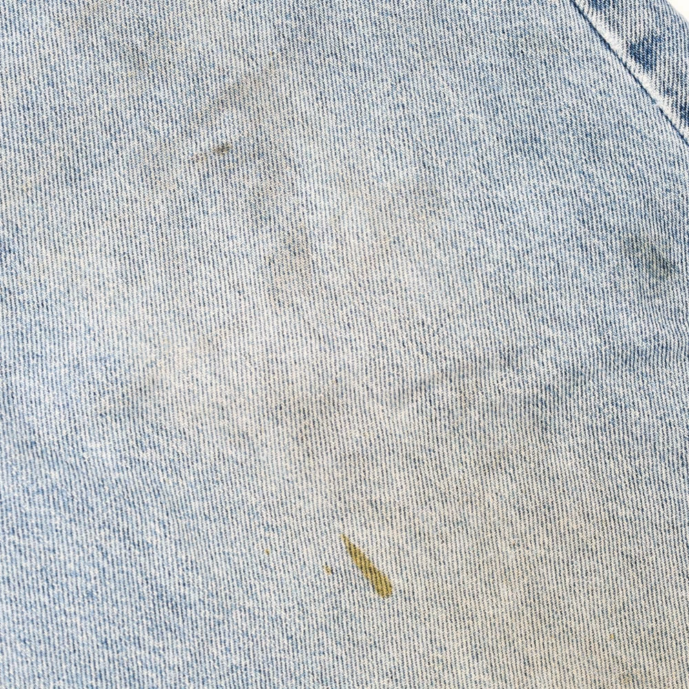 Flaws: marks throughout front and back, 1 belt loop ripped off, distressing on leg openings.